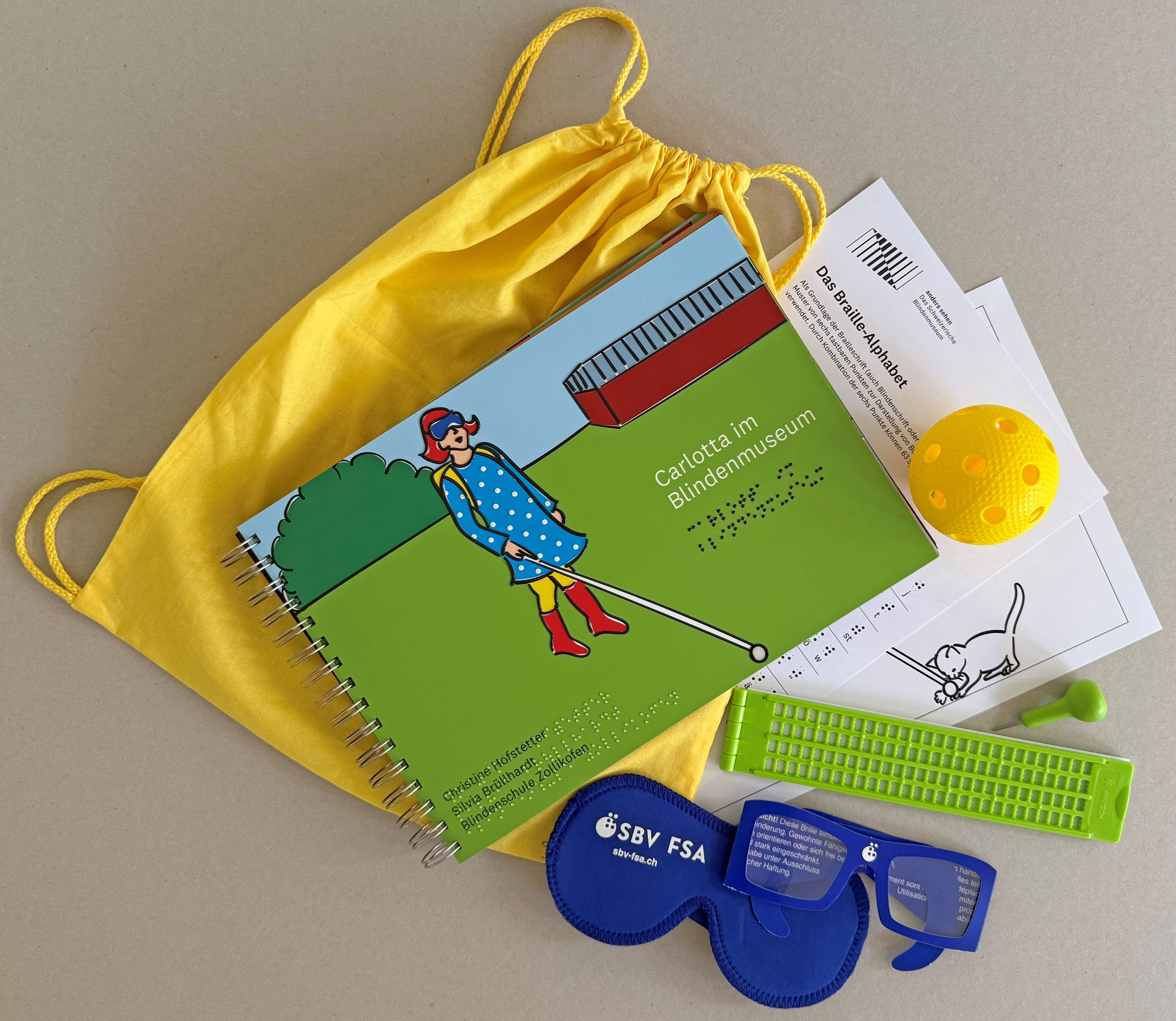 «Carlotta im Blindenmuseum» gibt es einzeln oder als Kreativset im gelben Stoff-Säcklein. Darin enthalten sind: